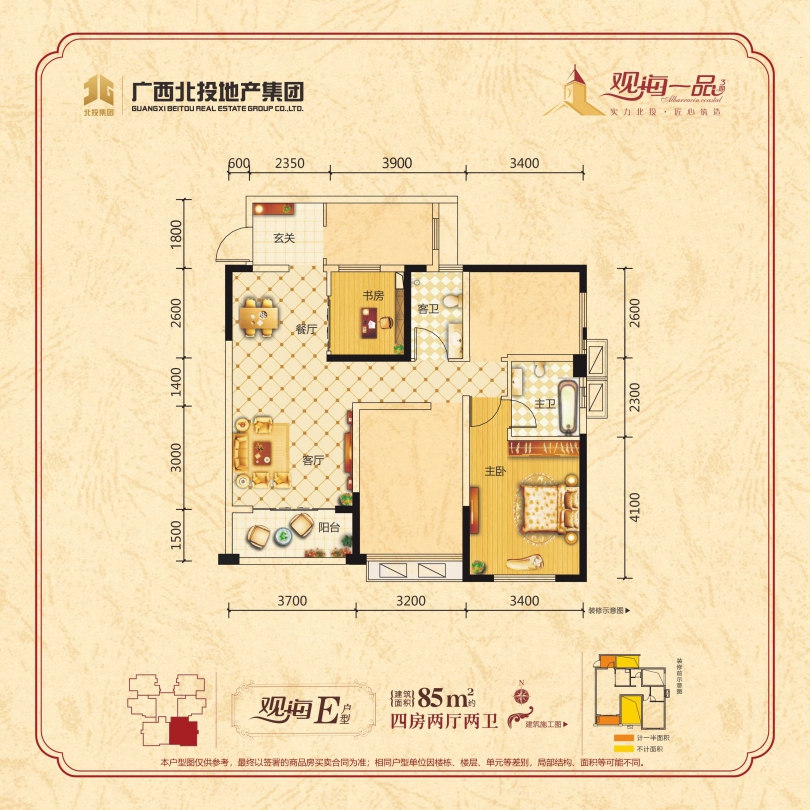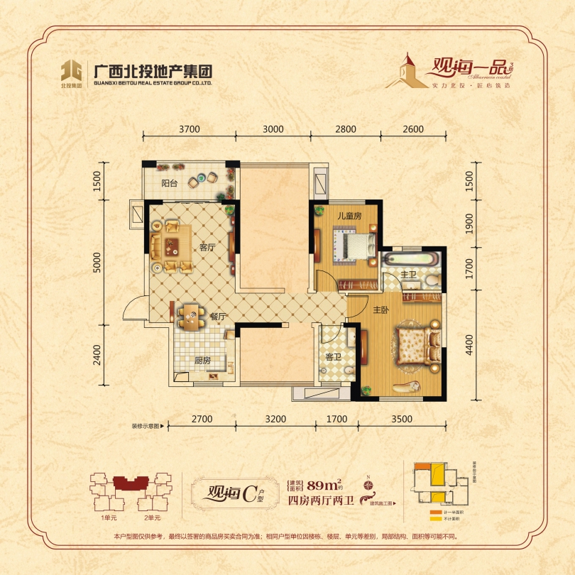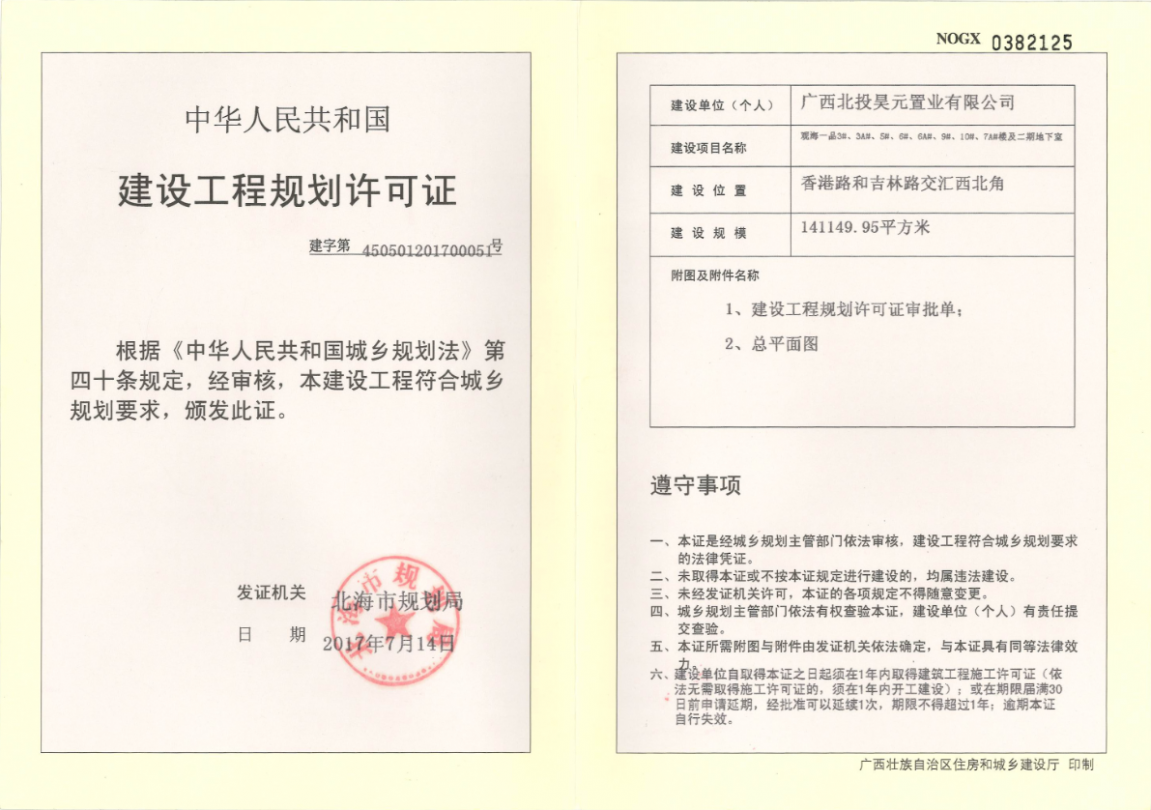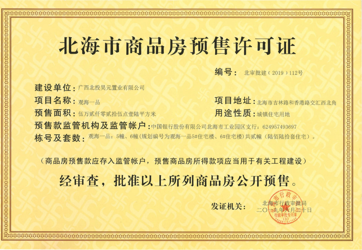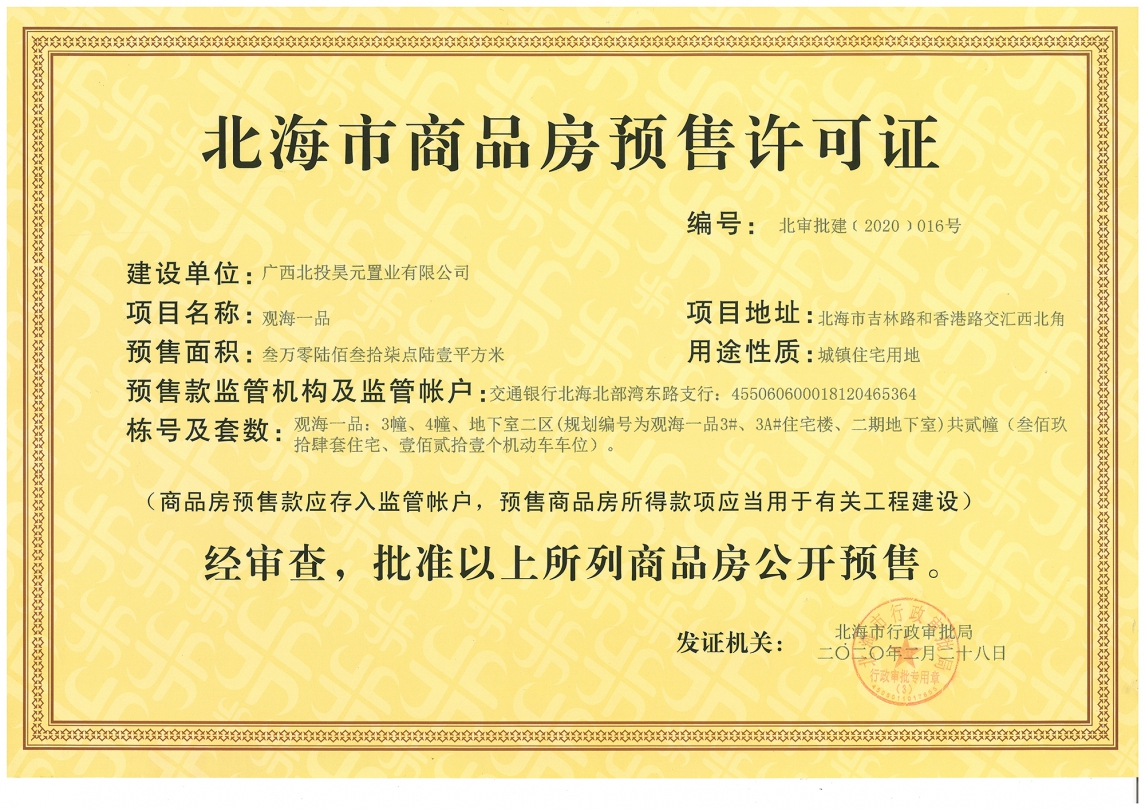 观海一品为广西北投地产集团有限责任公司旗下全资子公司--广西北投昊元置业有限公司在北海投资开发的大型房产项目。项目占地70416平方米(约合106亩),总建筑20余万平米,容积率2.5,绿化率高达45.3%,超宽楼间距200米,小区中庭园林高达50亩。项目位于香港路与海景大道交汇处东面,直面美丽的“廉洲湾”黄金北岸,距海边仅500米,占领了海湾新城门户要道和咽喉之地,可以说随着“一城两湾”的崛起,观海一品更是独占地段优势,未来增值空间无可限量。